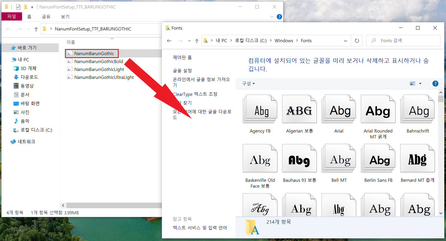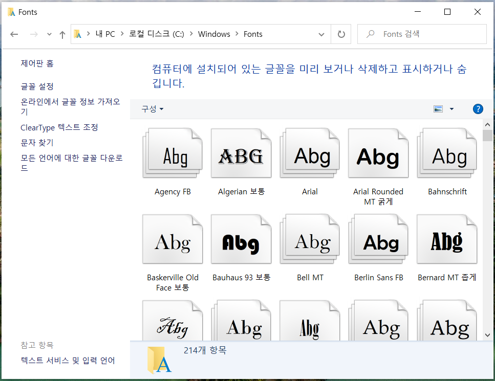 다운 받았으면 컴퓨터에 글씨체를 적용 시켜 줍니다. window10 글씨체는 C:\Windows\Fonts