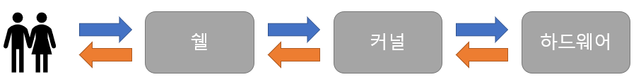 쉘은 간단하게 설명하면 사용자와 커널(OS,운영체제)을 연결해주는 역할을 한다고 생각하면 됩니다. 이는 사용자가 직접 커널에 명령을 내릴수 없기 때문입니다.